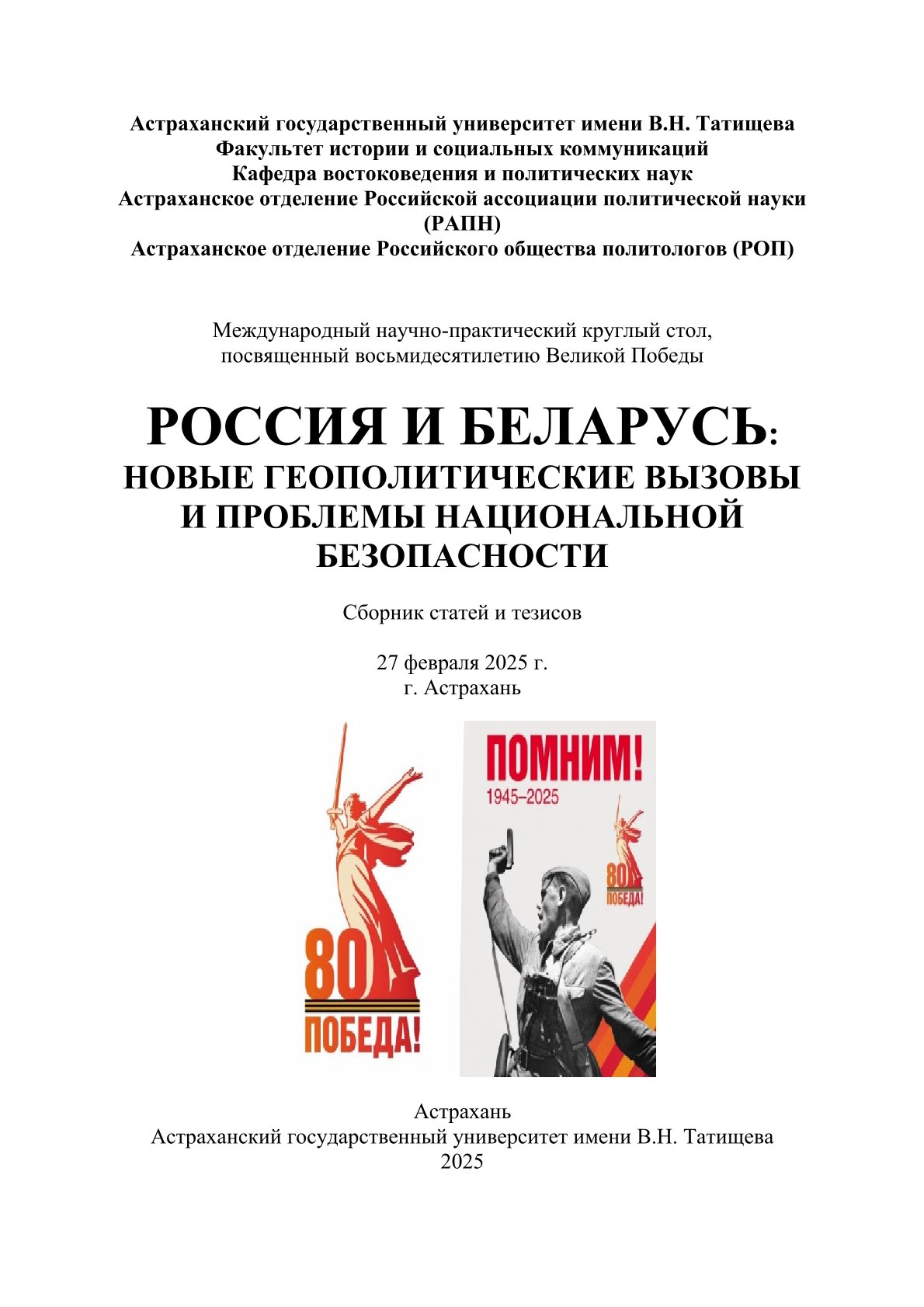 Россия и Беларусь: новые геополитические вызовы и проблемы национальной безопасности: материалы Международного научно-практического круглого стола, посвященного 80-тию Великой Победы (г. Астрахань, 27 февраля 2025 г.): сборник статеий и тезисов
