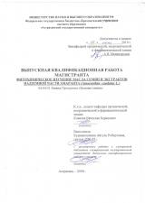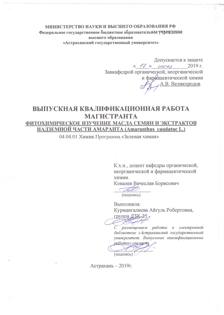 Фитохимическое изучение масла семян и экстрактов надземной части амаранта (Amaranthus caudatuc L.): магистерская диссертация: очная форма: 04.04.01 Химия: направление (профиль): Зеленая химия: химический факультет: кафедра органической, неорганической и ф