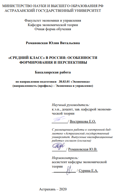 «Средний класс» в России: особенности формирования и перспективы: бакалаврская работа: очная форма: 38.03.01 Экономика: направление (профиль): Экономика и управление: факультет экономики и управления: кафедра экономической теории