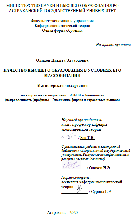 Качество высшего образования в условиях его массовизации: магистерская диссертация: очная форма: 38.04.01 Экономика: направление (профиль): Экономика фирмы и отраслевых рынков : факультет экономики и управления: кафедра экономической теории