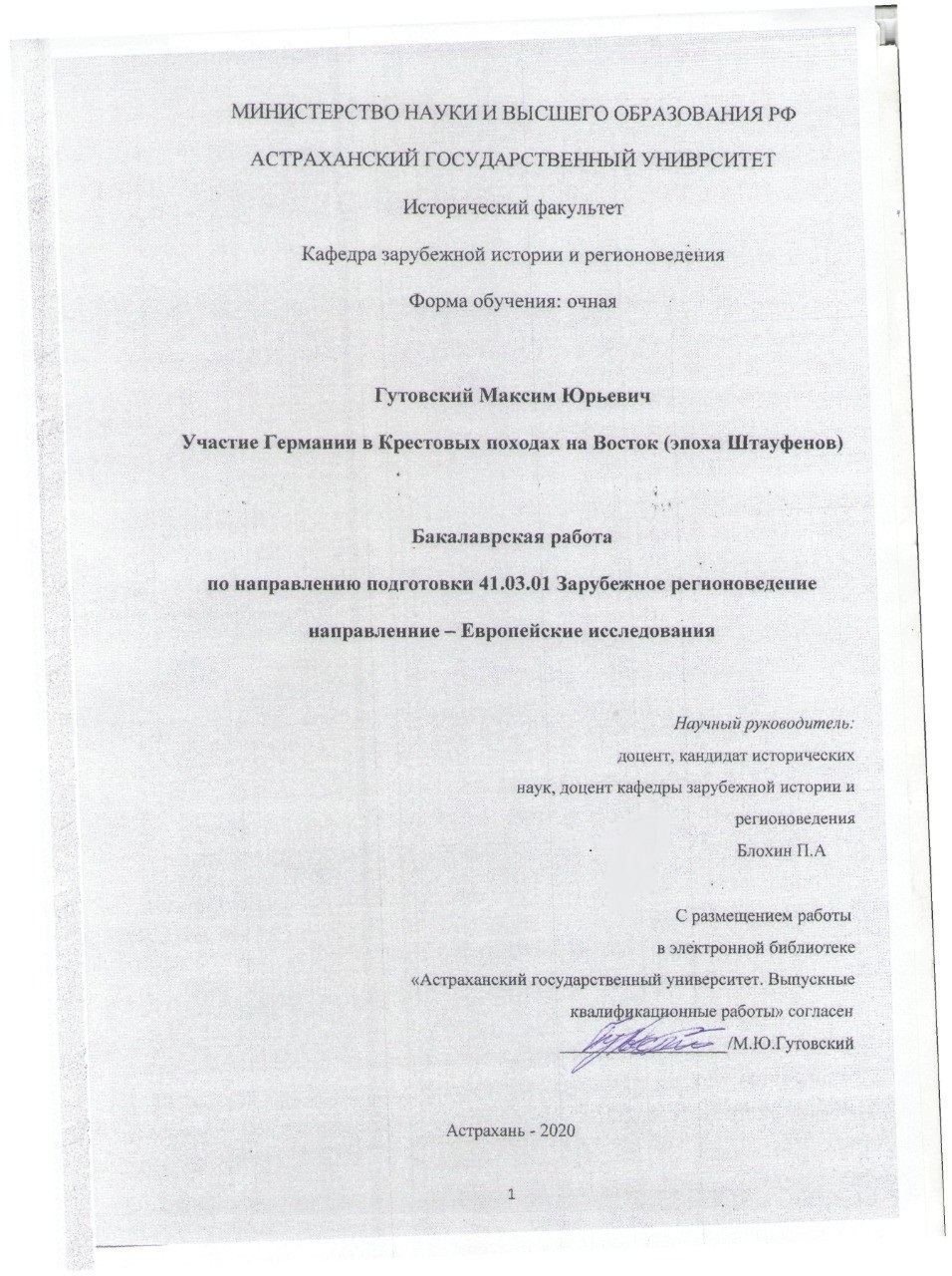 Участие Германии в Крестовых походах (эпоха Штауфенов):бакалаврская работа: очная форма: 41.03.01 Зарубежное регионоведение: направление(профиль):европейские исследования: исторический факультет: кафедра зарубежной истории и регионоведения