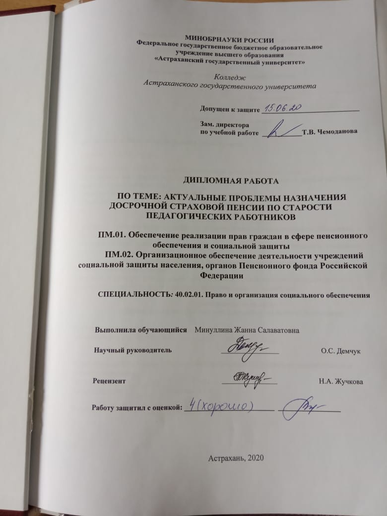 Актуальные проблемы назначения досрочной страховой пенсии по старости педагогических работников: дипломная работа: заочная форма: 40.02.01 Право и организация социального обеспечения: колледж Астраханского государственного университета: заочное отделение