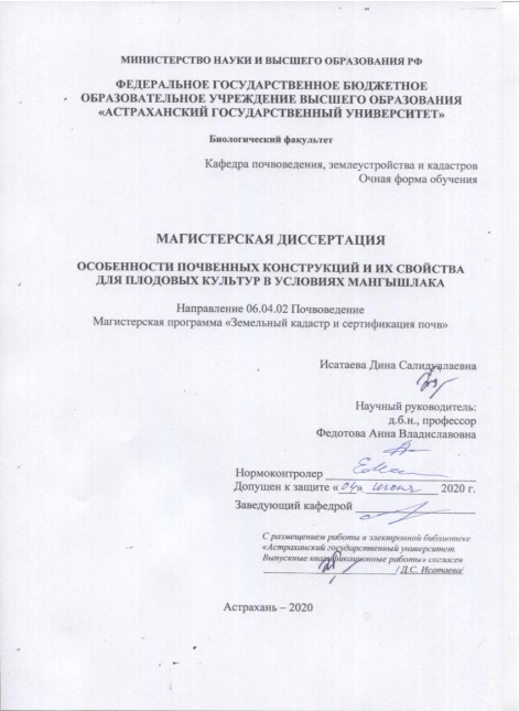 Особенности почвенных конструкций и их свойства для плодовых культур в условиях Мангышлака: магистерская диссертация: очная форма: 06.04.02 Почвоведение: Направленность (профиль): Земельный кадастр и сертификация почв: биологический факультет: кафедра поч